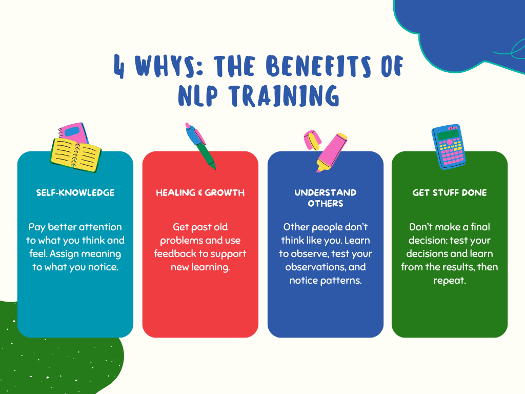 Self-awareness is not enough: you need to be able to see the meaning that makes sense of your awareness. NLP training offers many ‘aha’ moments when you see something about your own experience that you had not noticed before. It also teaches you some of the patterns and science that make sense of what you notice. It will even allow you to observe yourself as you change and decide whether to keep the change or shift it.